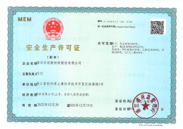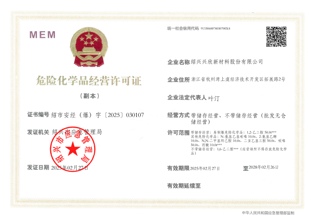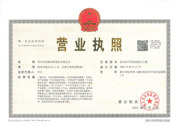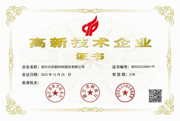 紹興興欣新材料股份有限公司成立于2002年06月27日,占地面積122畝,位于杭州灣上虞經濟技術開發區拓展路2號,現有職工200余人,專業技術人員50余人;博士、碩士研究生30余人組成的一支知識型、專業化的技術科研團隊。公司面向全球市場,專業開發電子化學品、環?;瘜W品、醫藥中間體、高分子材料等先進新材料重點領域的省級科技型企業;建有浙江上虞、安徽東至兩個生產基地。目前為“國家高新技術企業”、浙江省“隱形冠軍”企業、浙江省專精特新中小企業;建有“省級”研究開發中心,共建天津大學浙江紹興研究院電子化學品研發中心。